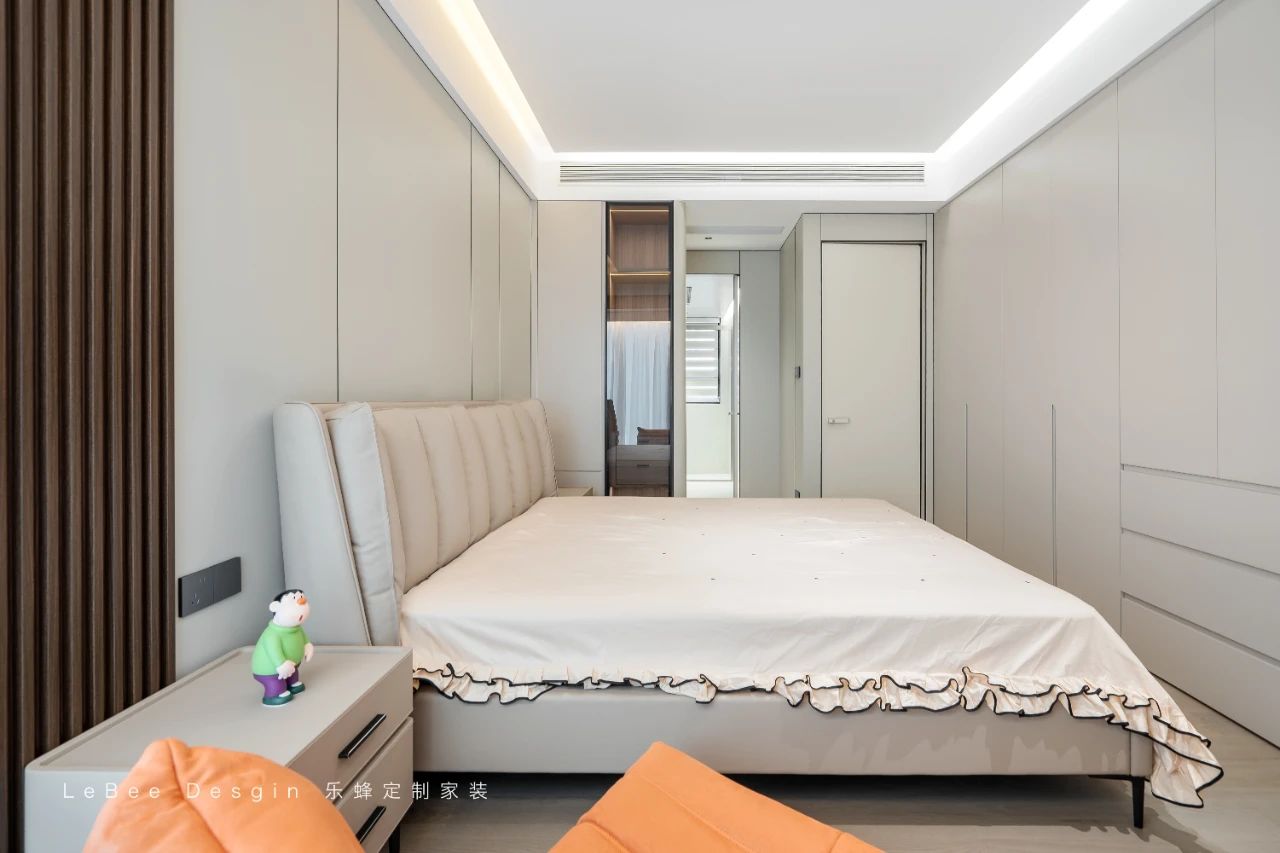 房間一側(cè)的一門到頂衣柜是一大亮點(diǎn)。通頂?shù)脑O(shè)計(jì)不僅充分利用了垂直空間,增加了儲(chǔ)物容量,還避免了頂部積灰的煩惱。簡(jiǎn)潔的柜門線條搭配隱形拉手,使衣柜與整個(gè)房間的風(fēng)格完美融合,既實(shí)用又美觀。