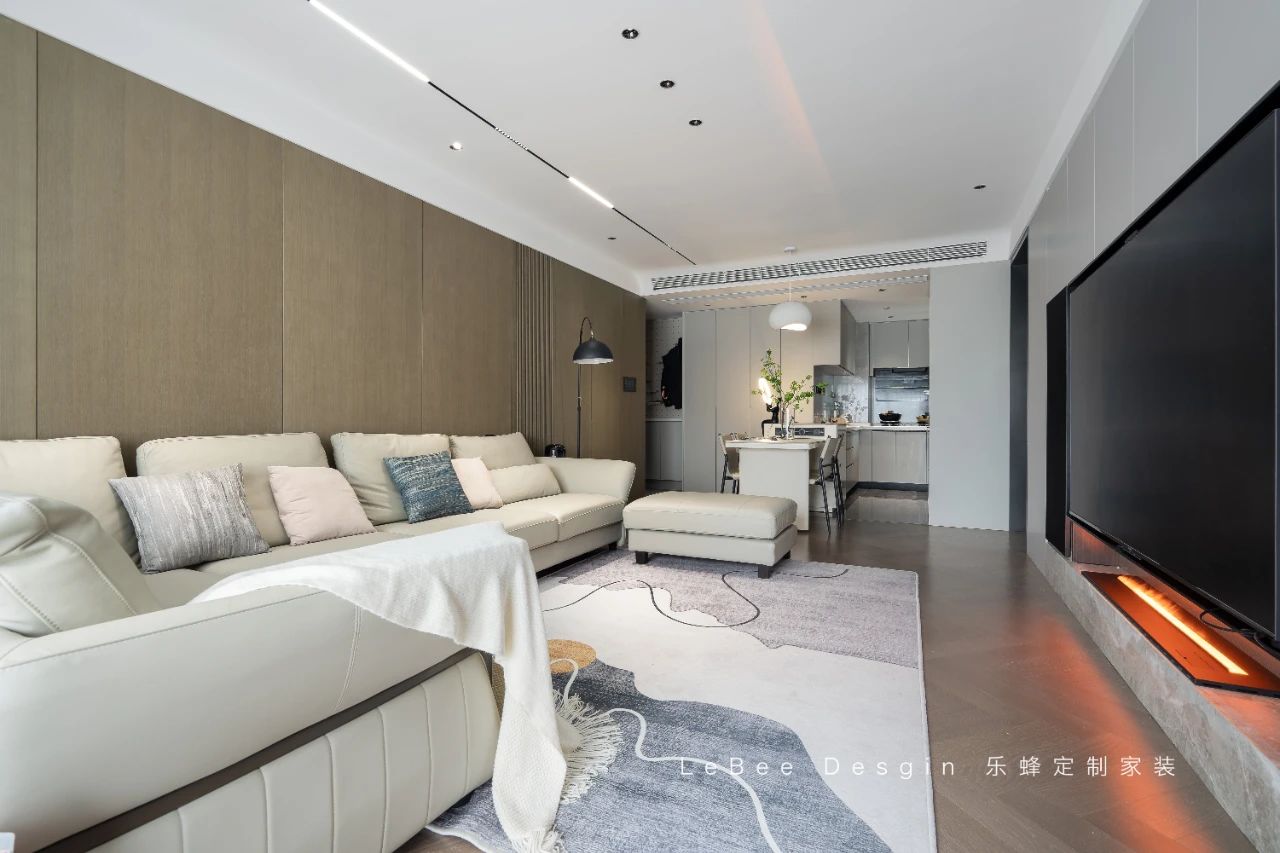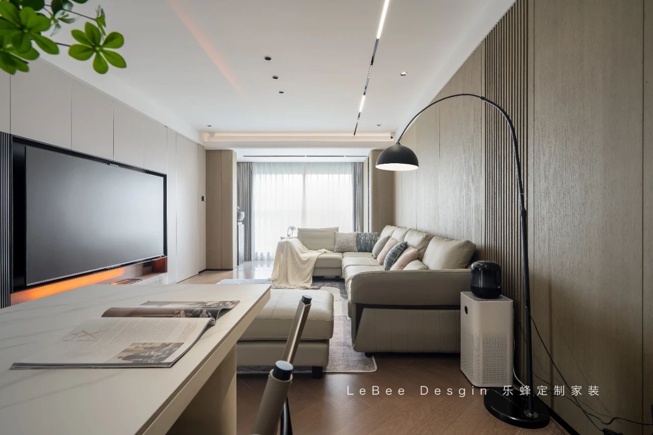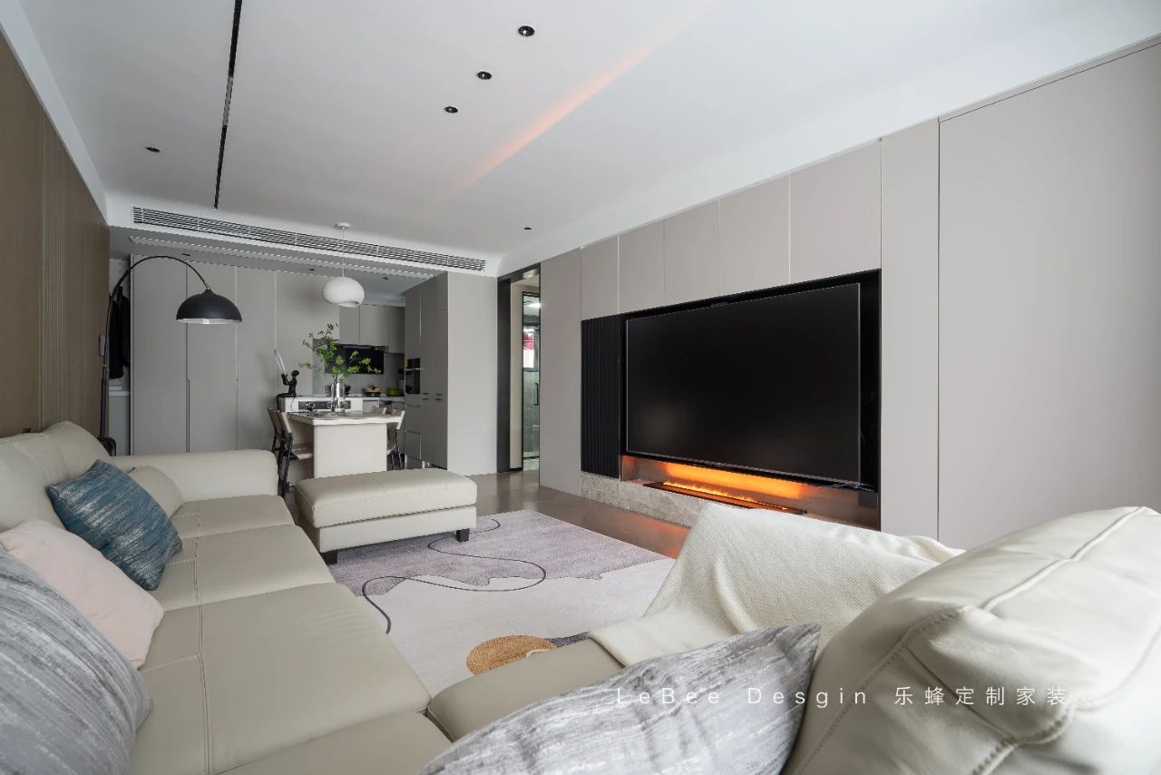 客廳選擇簡約大氣的電視背景墻,電視背景墻由木格柵、巖板巧妙組合而成,巖板的地臺加上??壁爐十分靈動。
