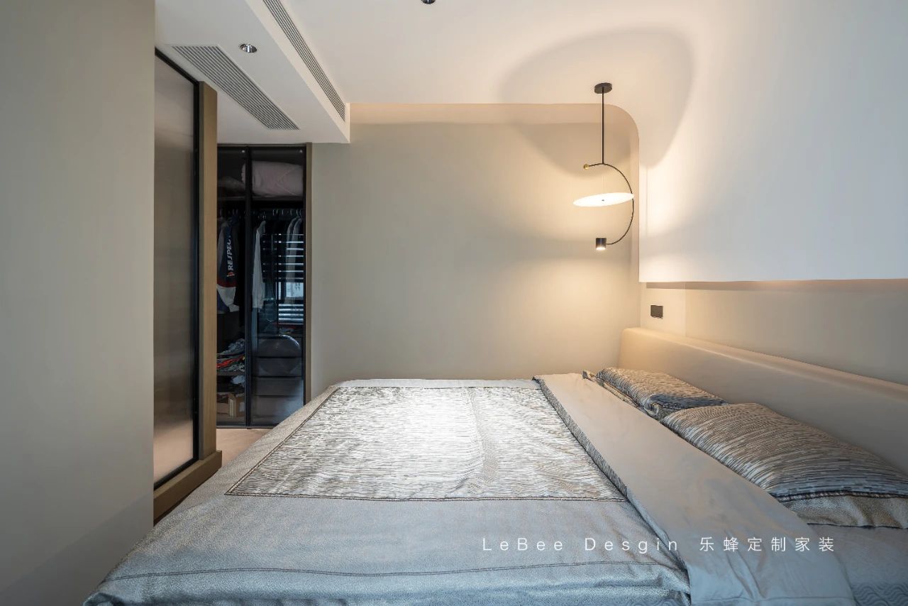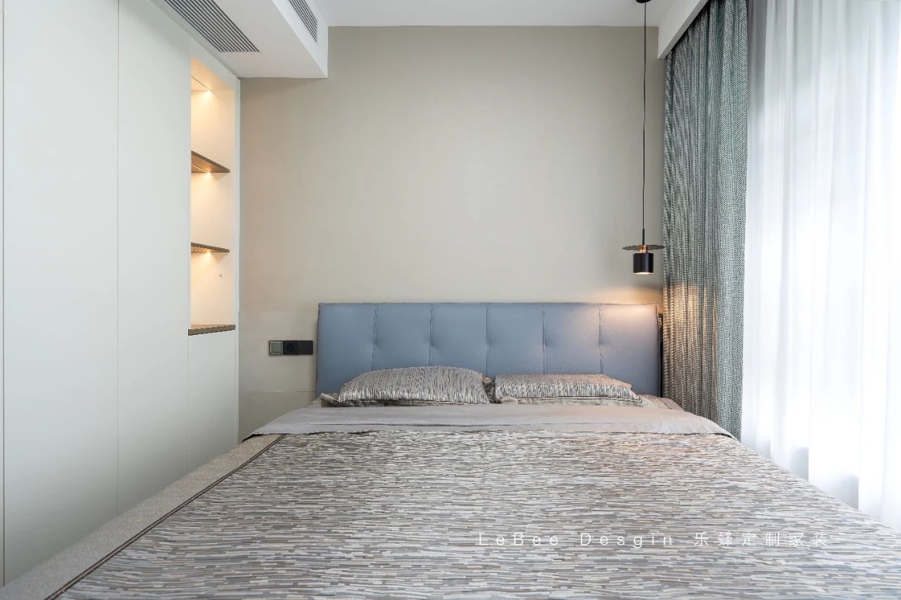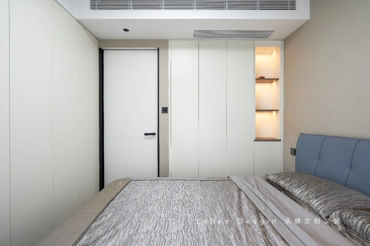 床尾的衣柜,搭配的都是無把手的柜門,望過去就像墻體一樣,不會覺得擁擠。