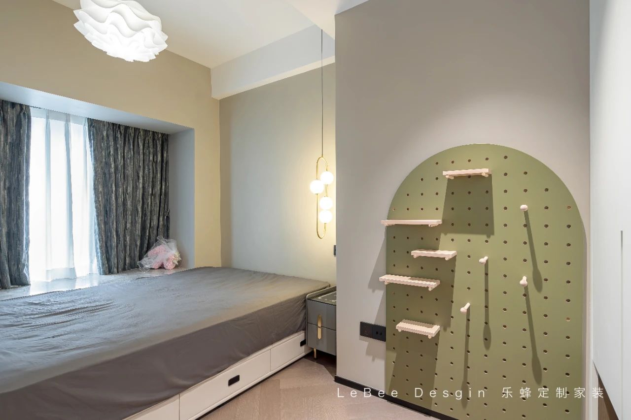 為了給小朋友增添一絲樂趣,我們利用墻面打造一個弧形洞洞板,衣柜是一門到底的奶油白設(shè)計,中下方鏤空設(shè)計,整體的收納空間很充裕!