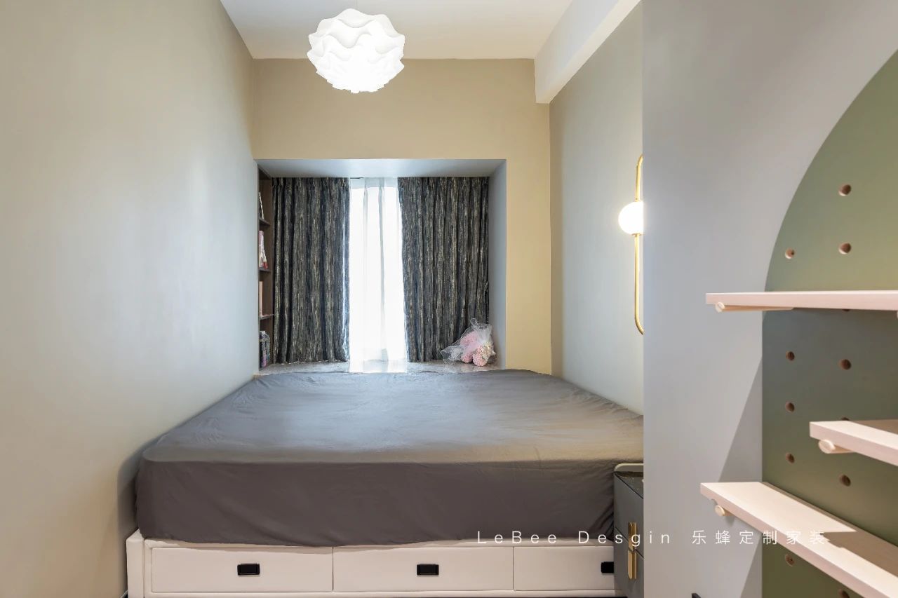 兒童房面積不是很大,活動空間不足,利用飄窗做了開放格設(shè)計,平時可以放一些書籍,床改做榻榻米的設(shè)計,床下柜儲物空間嘎嘎大。