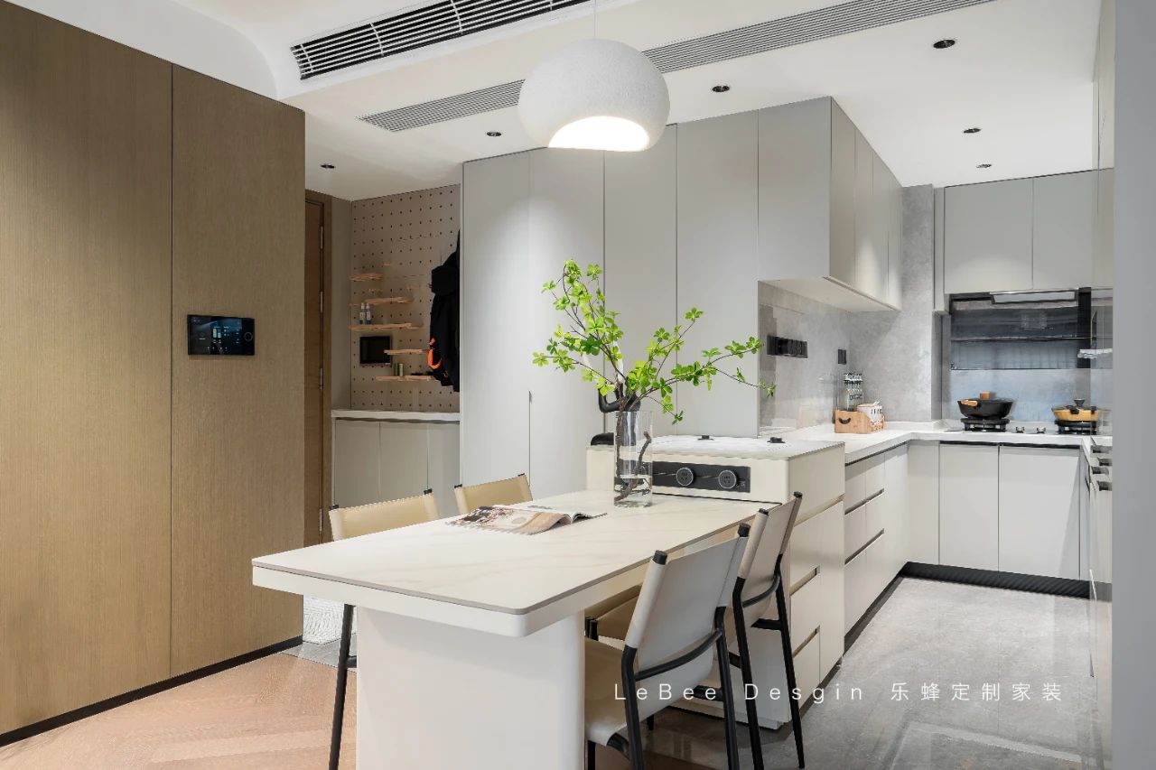 開放式廚房,大大增大客餐廳的空間感,島臺加餐桌設(shè)計,延長了廚房的使用空間的同時,也提升了空間結(jié)構(gòu)的豐富性,更大大提高了日常生活的便利性。無論是烹飪還是用餐,這樣的布局都顯得簡約而實用,同時島臺也成為了進門的一個隔擋位,做了風水處理。