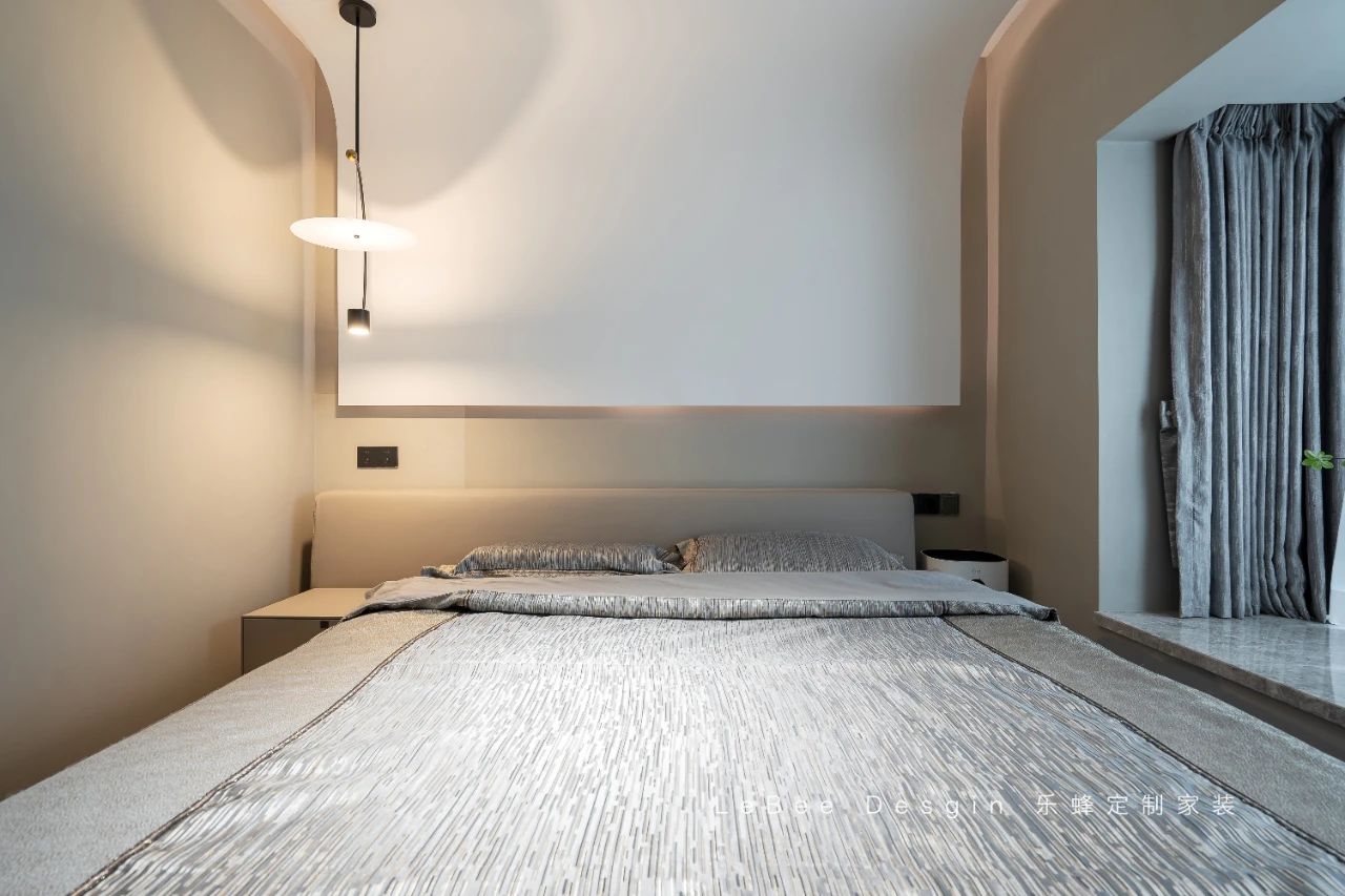 主臥延續(xù)客廳的風格,以淺咖色為主基調(diào),床頭不做復(fù)雜造型,做半墻背景,內(nèi)嵌燈帶,增加層次感的同時,也增加了照明,氛圍感超好。