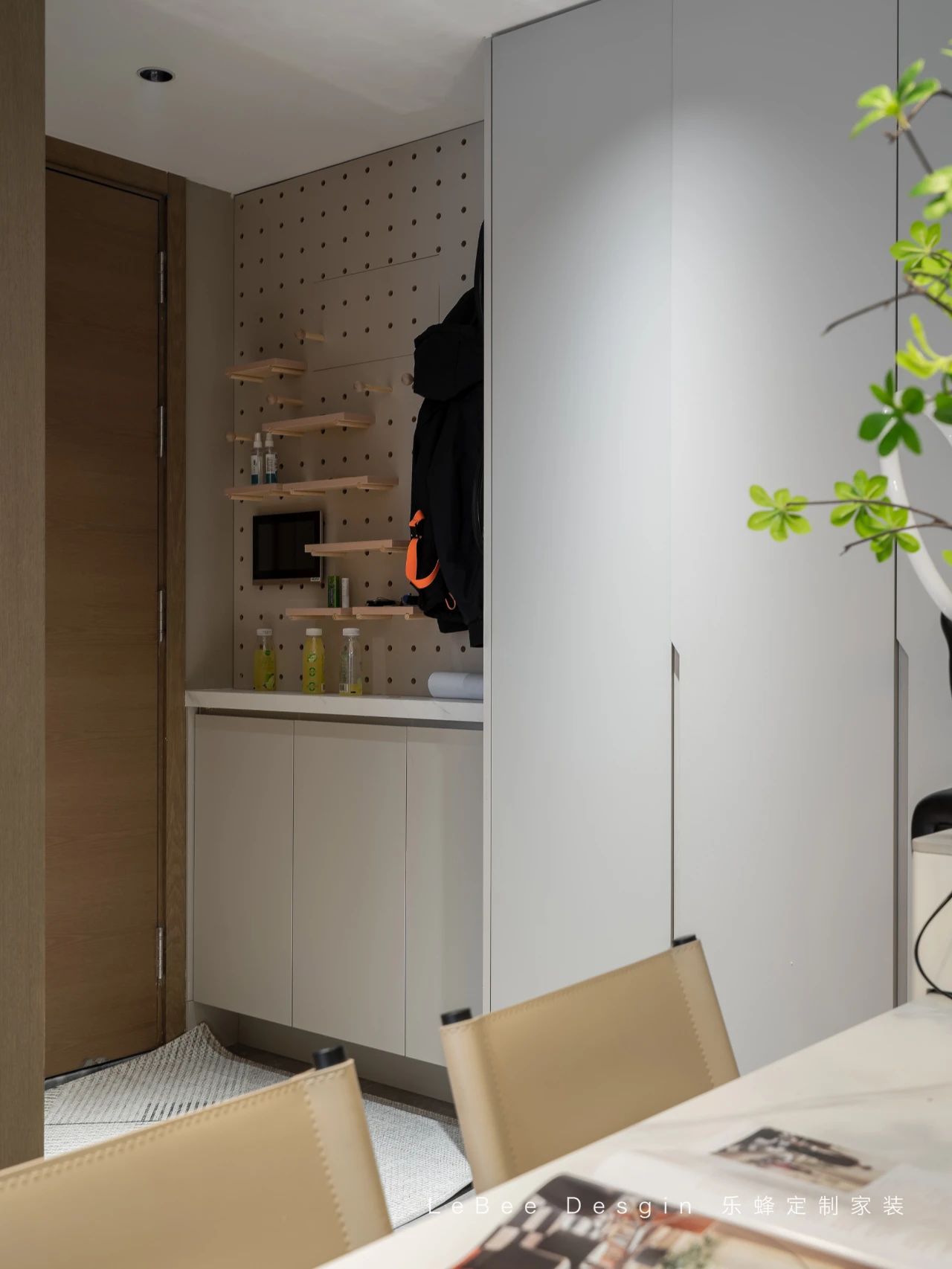 入戶門口比較窄,設(shè)計師根據(jù)業(yè)主的需求裝個洞洞板,日??梢話煲路€匙雨傘等。平時也可以放掛畫綠植配飾點綴很不錯~再旁邊裝一個一門到頂?shù)拿装咨褡?,增加儲物空?/div>