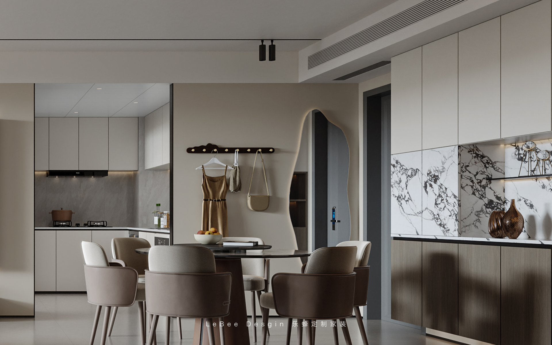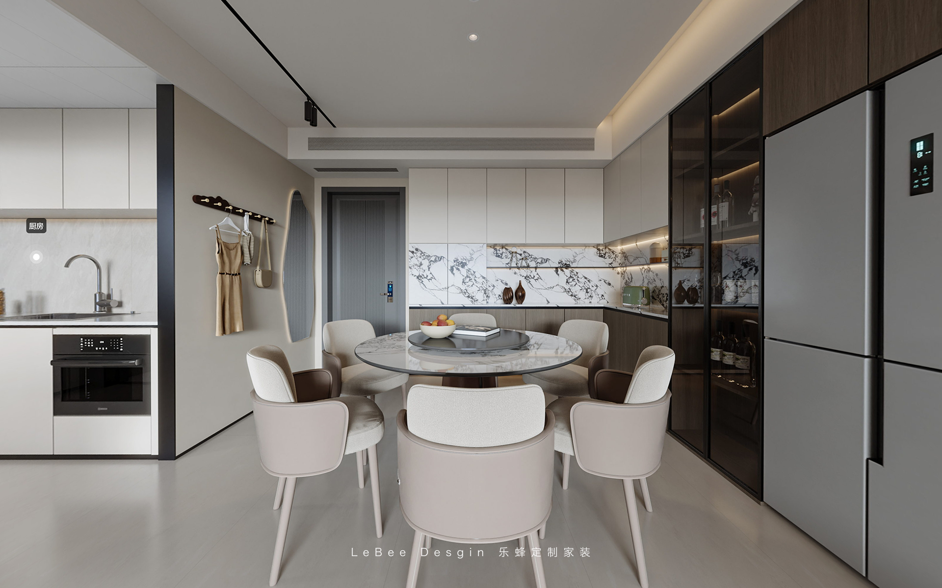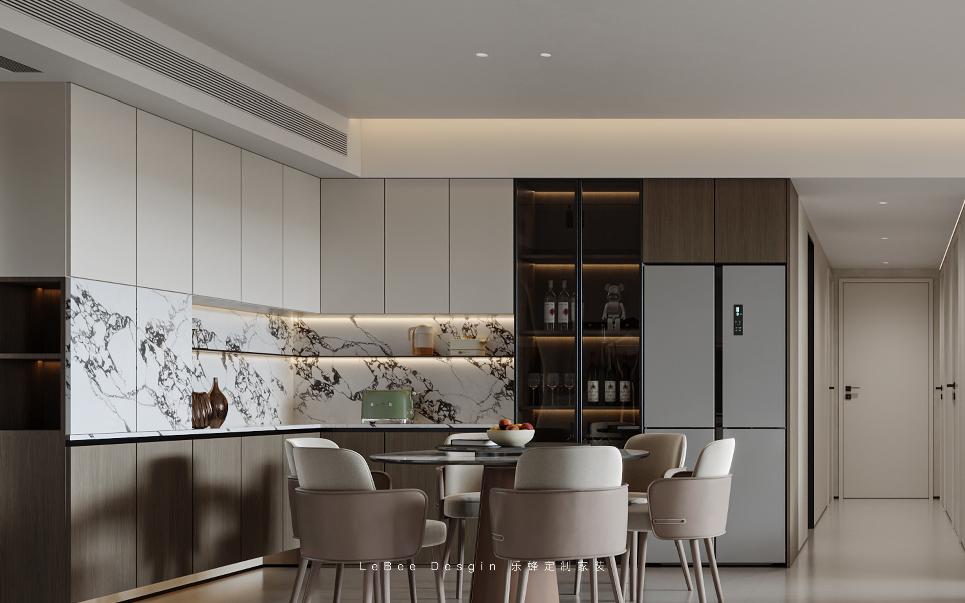 本案例位于悅峰華府,業(yè)主一家四口,想做現(xiàn)代風格,平時喜歡喝茶需要一個品茗的區(qū)域,經(jīng)常做飯,儲物要多,需要一個小孩獨立玩耍學習的空間。我們設計師根據(jù)需求,客廳與陽臺打通,打造品茗區(qū),餐廚打通,設計餐廚一體,打造滿墻收納柜,滿足了業(yè)主生活空間!整體色調溫馨大氣,用大理石點綴提升舒適大氣的感覺。