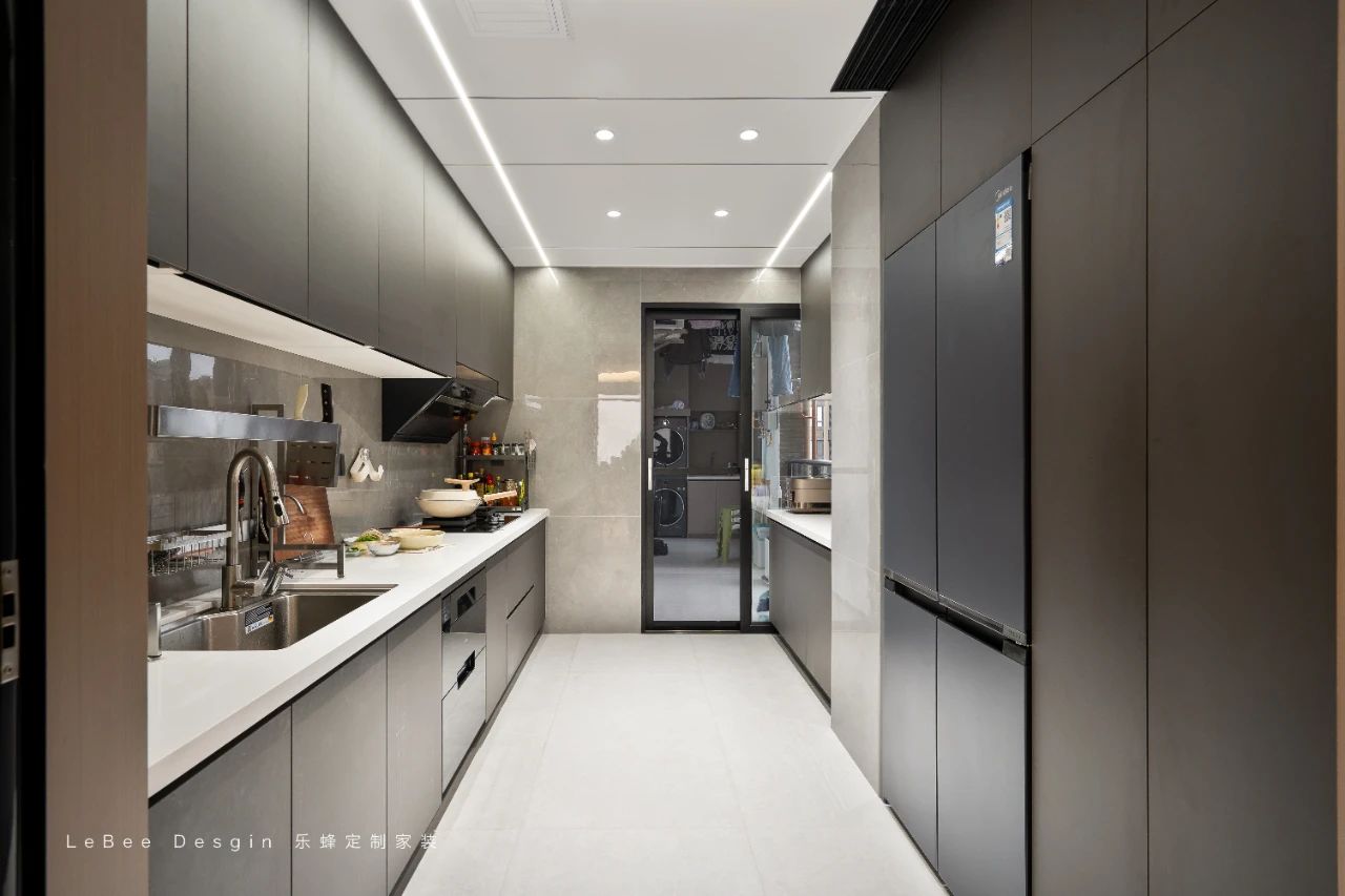 采用 U 型布局,利用墻面打造豐富收納,操作臺面連貫,洗菜、切菜、烹飪流程順暢,符合人體工學(xué),提升下廚效率 。