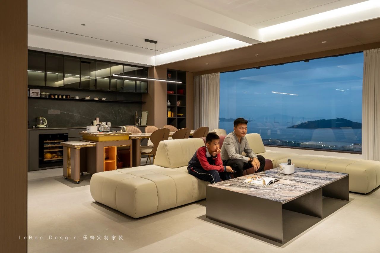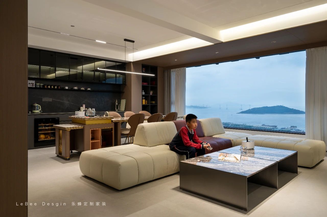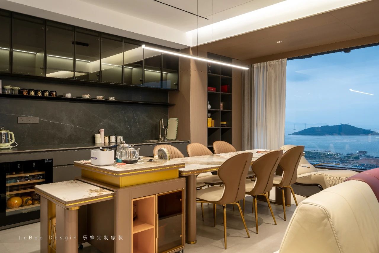 開放式西廚打破封閉,與客廳、觀景區(qū)域無縫銜接,烹飪時能與家人互動,用餐時可賞窗外湖海山色,讓美食與景致、情感共融,延展生活場景的豐富度 。 深色玻璃柜體,藏納餐具雜物,燈帶勾勒出精致輪廓,開放架陳列書籍、裝飾,將實用收納與藝術(shù)展示結(jié)合,簡潔又顯格調(diào)。