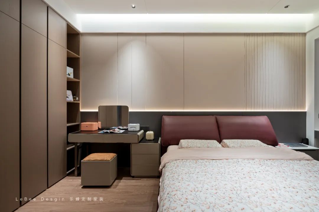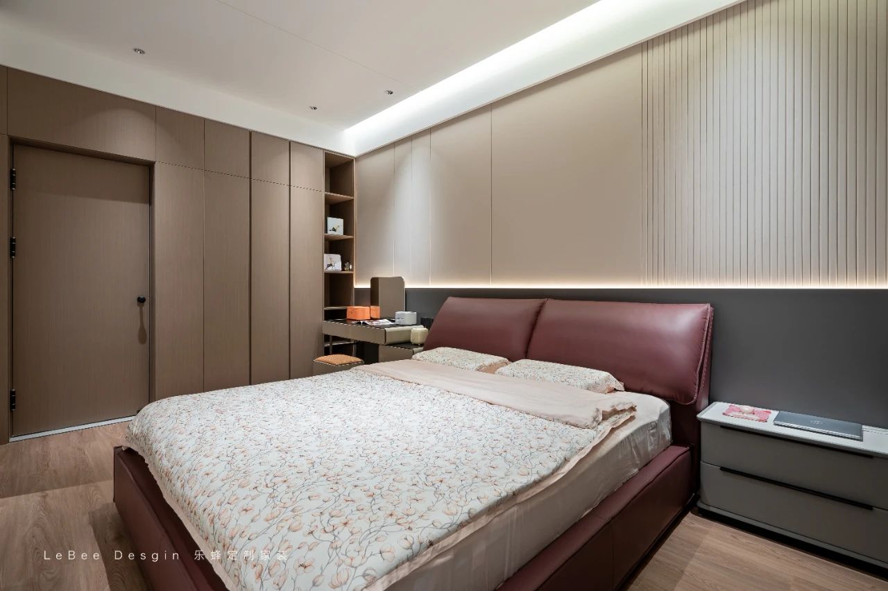 主臥以低飽和的暖棕、深灰為主色調(diào),營造出靜謐、溫潤的休憩氛圍,仿佛把陽光揉進(jìn)空間,給人歸家即放松的愜意感。 以低飽和的暖棕、深灰為主色調(diào),天花板線性燈帶、床頭暗藏氛圍燈,替代主燈的強光壓迫,柔和光線鋪滿空間,夜晚起夜不刺眼,睡前也能享受溫馨光暈。