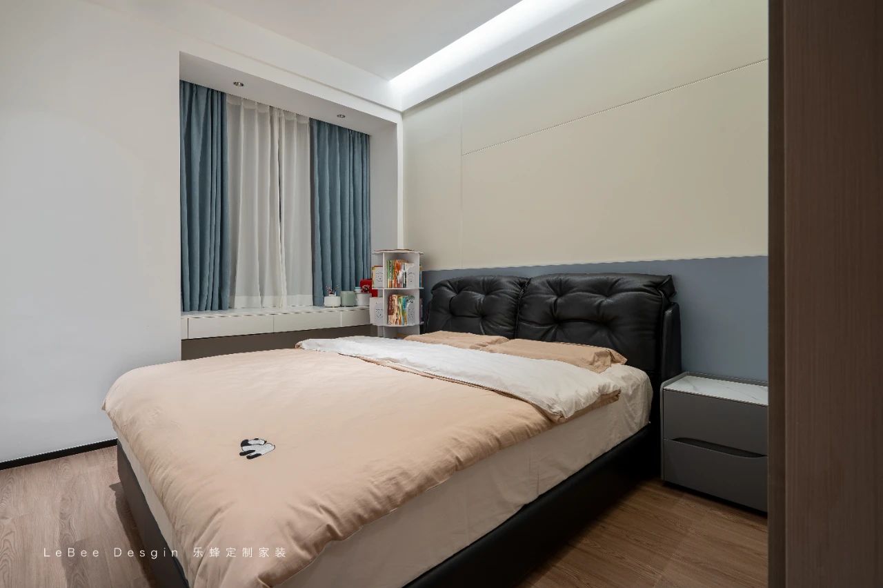 次臥設(shè)計遵循簡約實用原則,延續(xù)整體空間風(fēng)格。布局與示例統(tǒng)一,靠窗設(shè)一體化收納飄窗,高效利用空間,床與床頭背景墻規(guī)整擺放,視覺和諧。