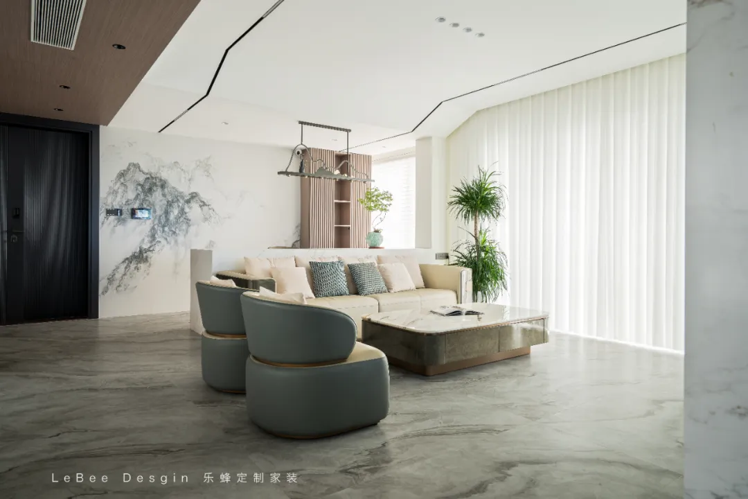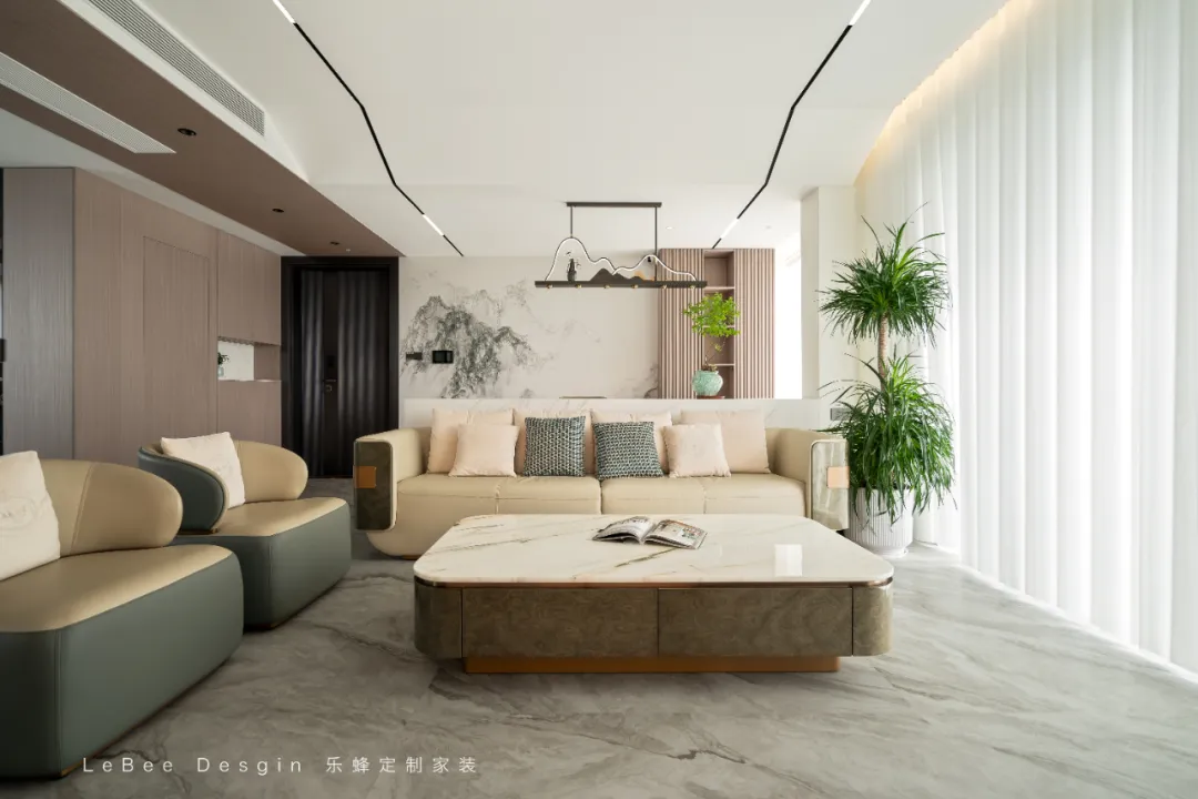 沙發(fā)換成了米白 + 淺綠拼色的大尺寸款式,搭配同色系弧形單人椅,加上帶金屬邊的大理石茶幾,柔和中透著精致;抱枕用了格紋款做點綴,增加了細節(jié)層次。