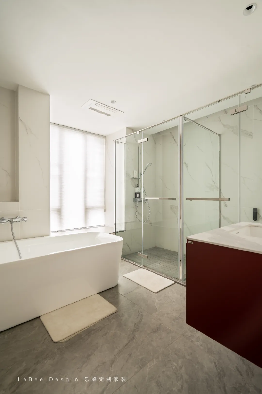 墻面、地面都用了仿大理石瓷磚,搭配玻璃淋浴隔斷,整體干凈通透;浴缸選了獨立式白色款,和空間基調呼應,提升了高級感。