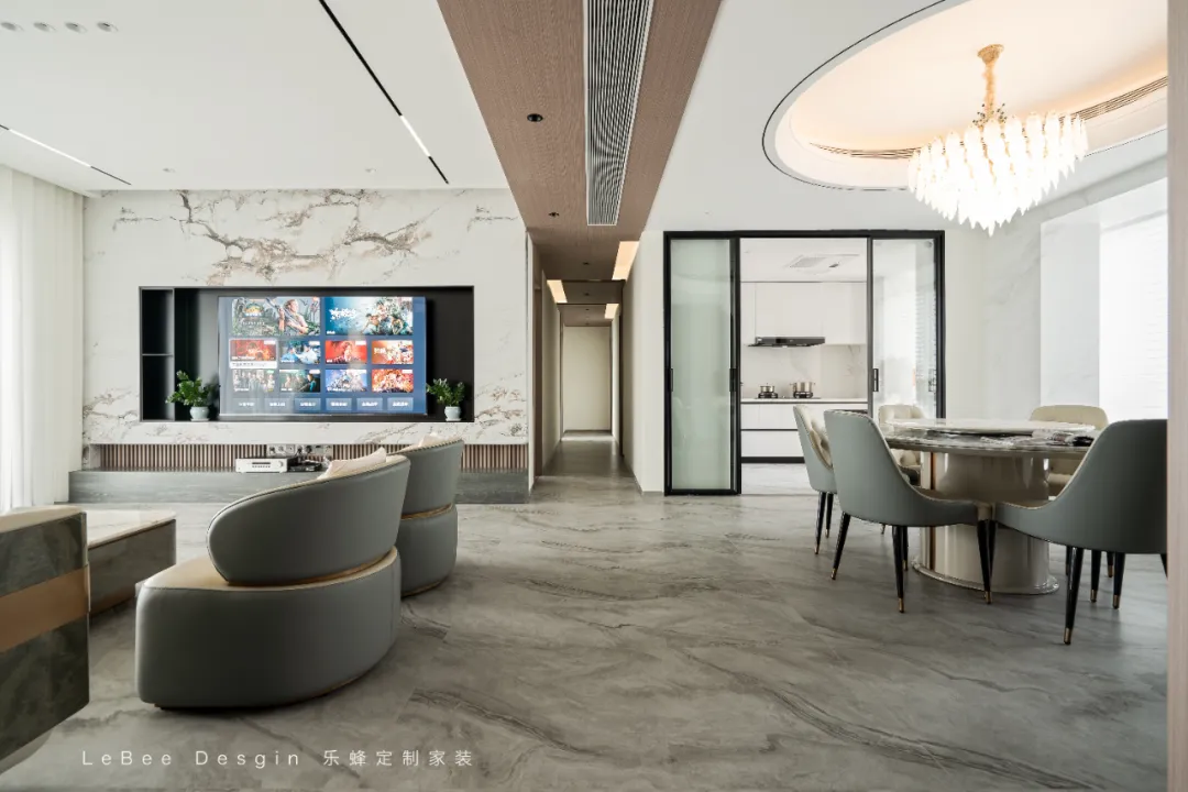 圓形大理石餐桌 + 拼色餐椅,搭配金色腳架細節(jié),輕奢感拉滿;上方的水晶吊燈 + 圓形吊頂燈帶,既呼應了餐桌形狀,又提升了用餐氛圍。