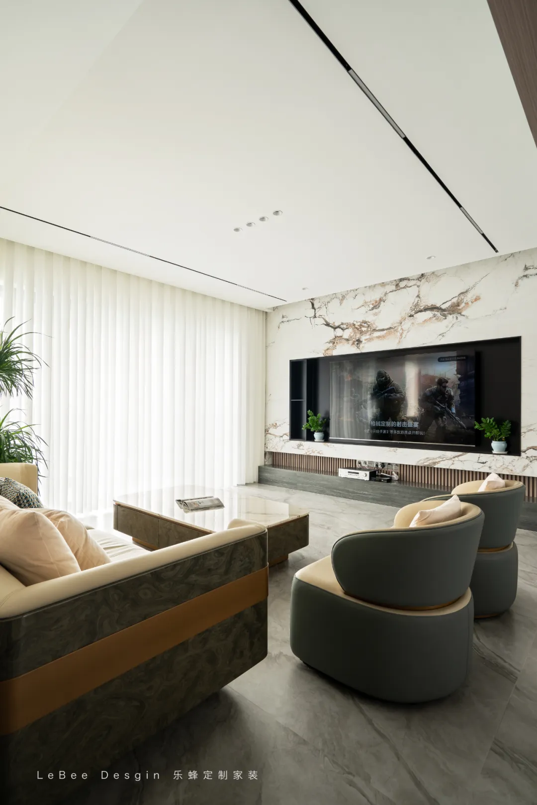 墻面大理石、地面仿石磚、木色柜體的搭配,和客廳區(qū)域完全統(tǒng)一,讓整個空間風格更連貫。