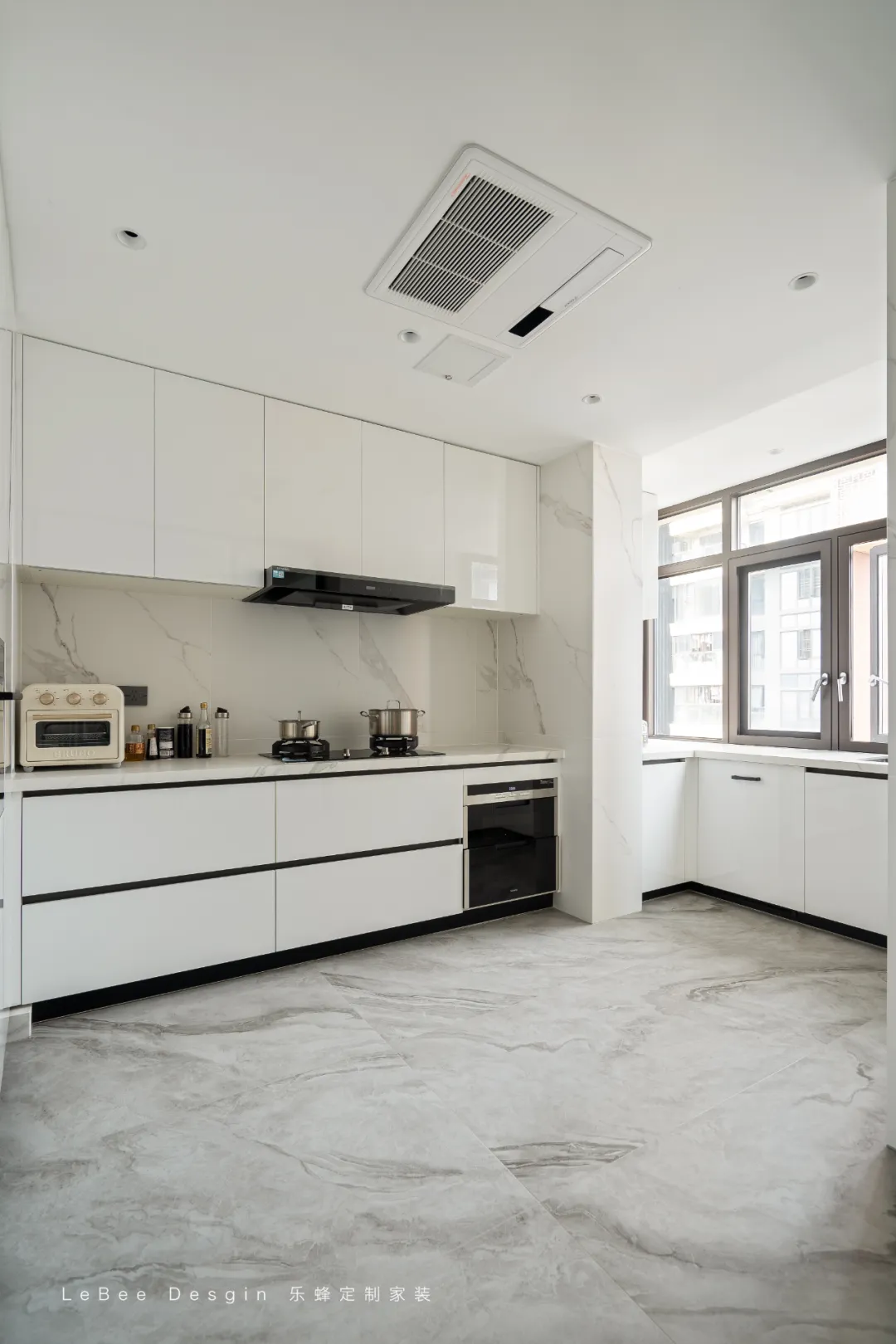 新增了大理石臺面的中島臺,既做了客餐廳的過渡,也增加了操作,休閑區(qū),讓開放式空間的實用性更強。