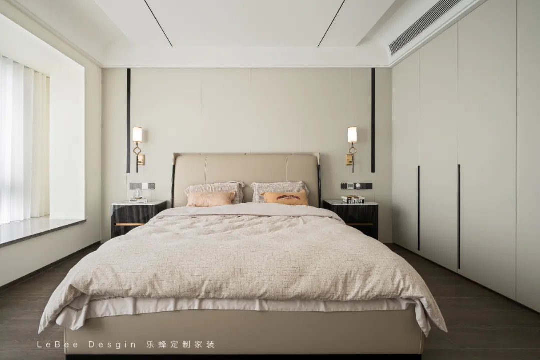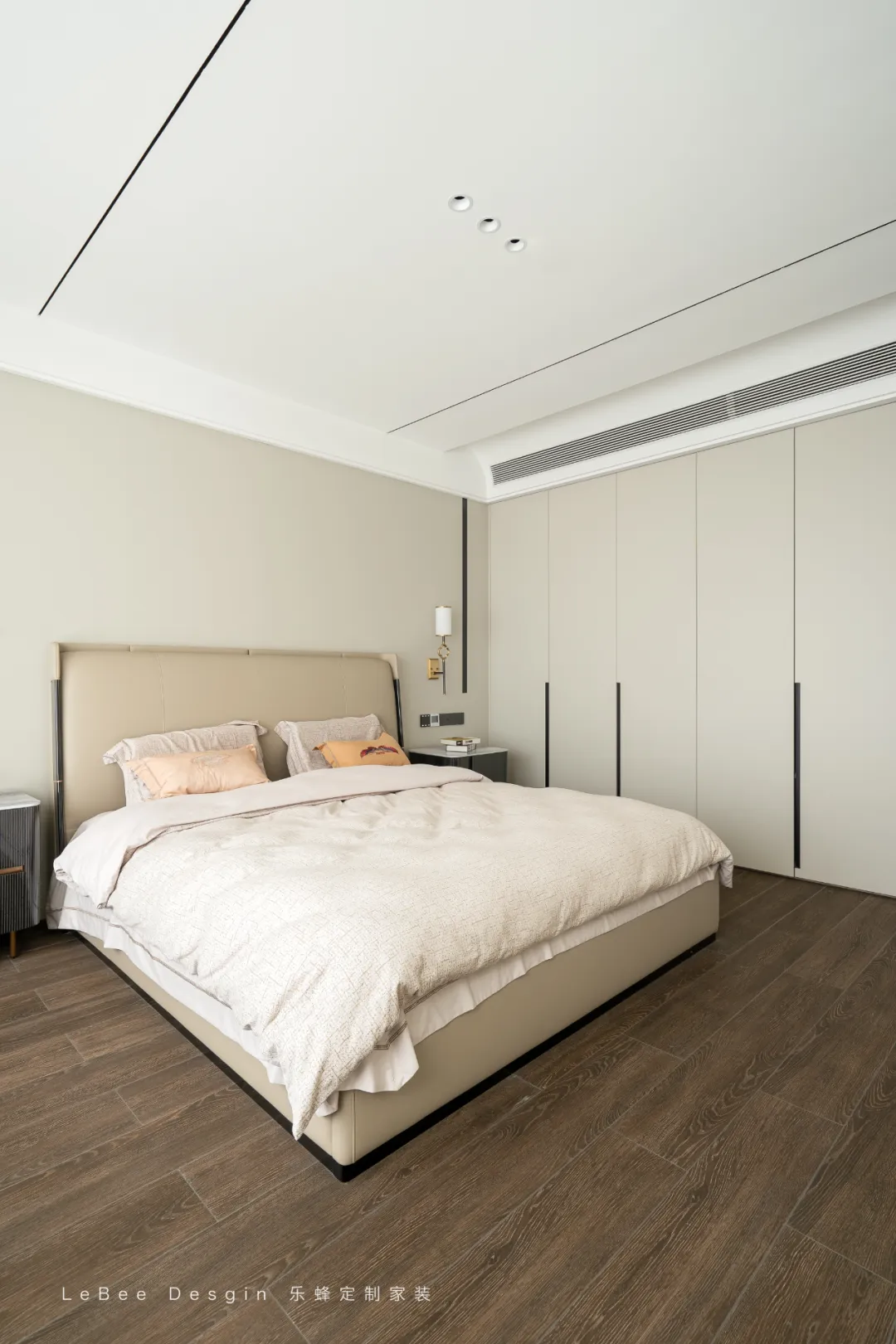 主臥以淺米色、暖杏色為主色調,搭配深色木地板,加上皮質軟包床頭,整體質感溫潤松弛;床頭兩側的金屬壁燈,既做了照明補充,又點綴了輕奢細節(jié)。