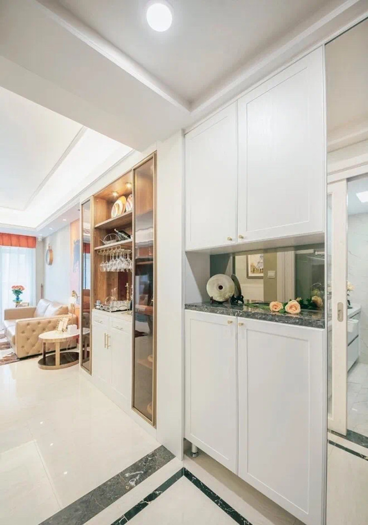 玄關(guān)處可以設(shè)計成小吧臺、小辦公區(qū)、收藏區(qū)等等。高效的利用空間,提高生活品質(zhì)。玄關(guān)雖小,但五臟俱全。