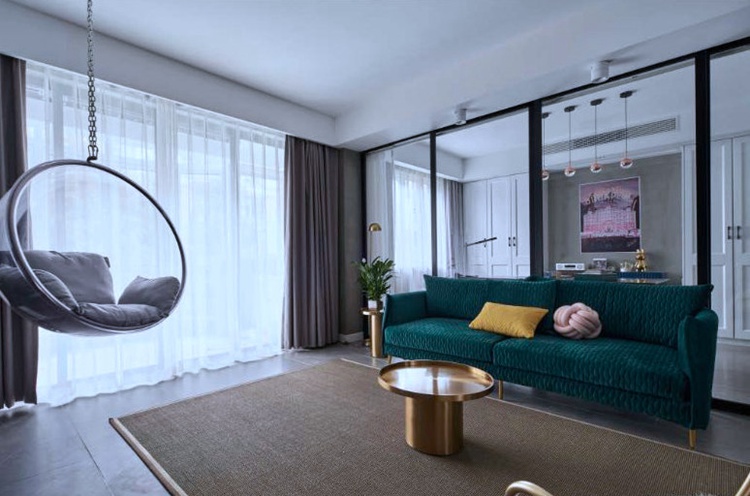 客廳部分比較中規(guī)中矩,除了最簡潔的背景墻水泥漆,胡桃木色的電視柜,因為業(yè)主家里養(yǎng)貓,所以用了劍麻地毯,綠絲絨沙發(fā)也挺好打理。