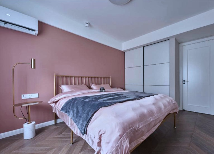 主臥地板是實木橡木色人字拼,業(yè)主個人非常喜歡地上的金色地毯,本來是想放在客廳的,覺得難打理就搬上來了。床頭柜用了胡桃木色,看起來還挺搭的。