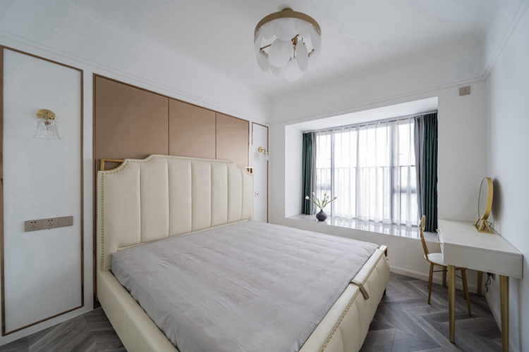 次臥采用灰綠背景墻,延續(xù)客廳“綠+金色”的輕奢組合搭配,讓次臥看起來(lái)更豐富有層次。